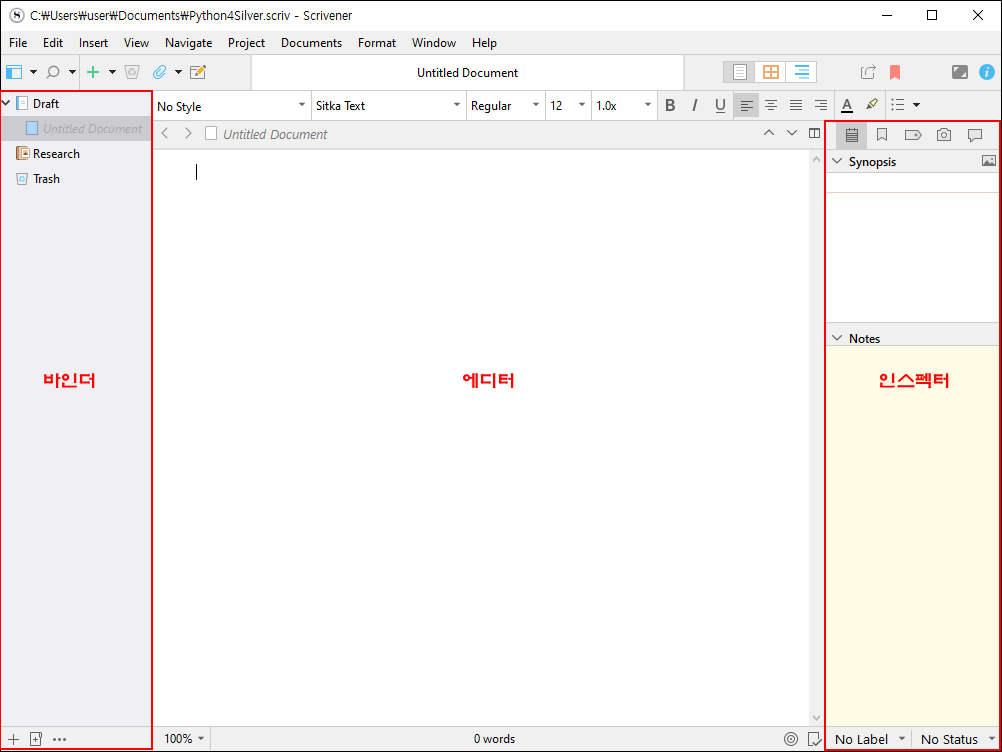 책 제작 도구, 스크리브너 구성은 다음과 같습니다. 에디터를 가운데 두고 바인더와 인스펙터가 날개를 이루는 구조가 기본입니다. 물론 사용자 의도에 따라 구성은 달라질 수 있습니다.