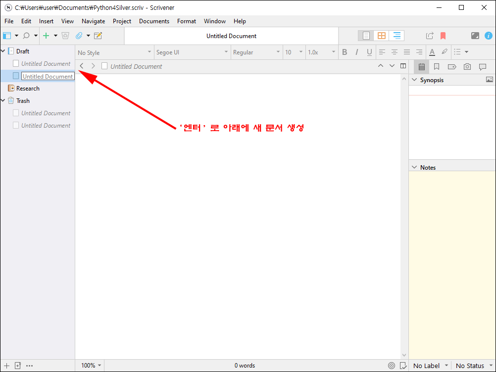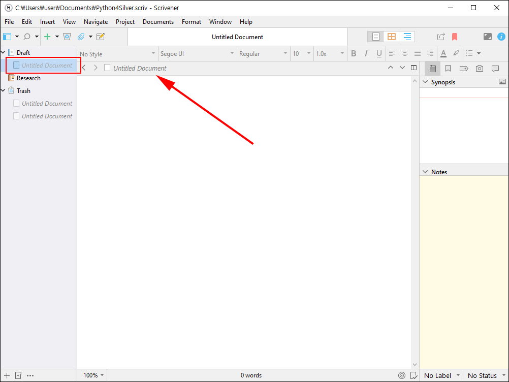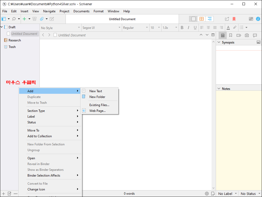 'Add > New Text'를 선택합니다. 드래프트 폴더 아래 새 문서가 만들어집니다. 제목을 부여하지 않으면 바인더에는 회식의 이탤릭체로 'Untitled Document'라고 표시됩니다.