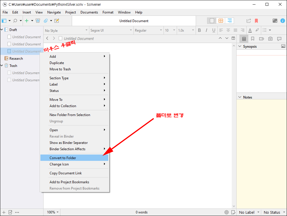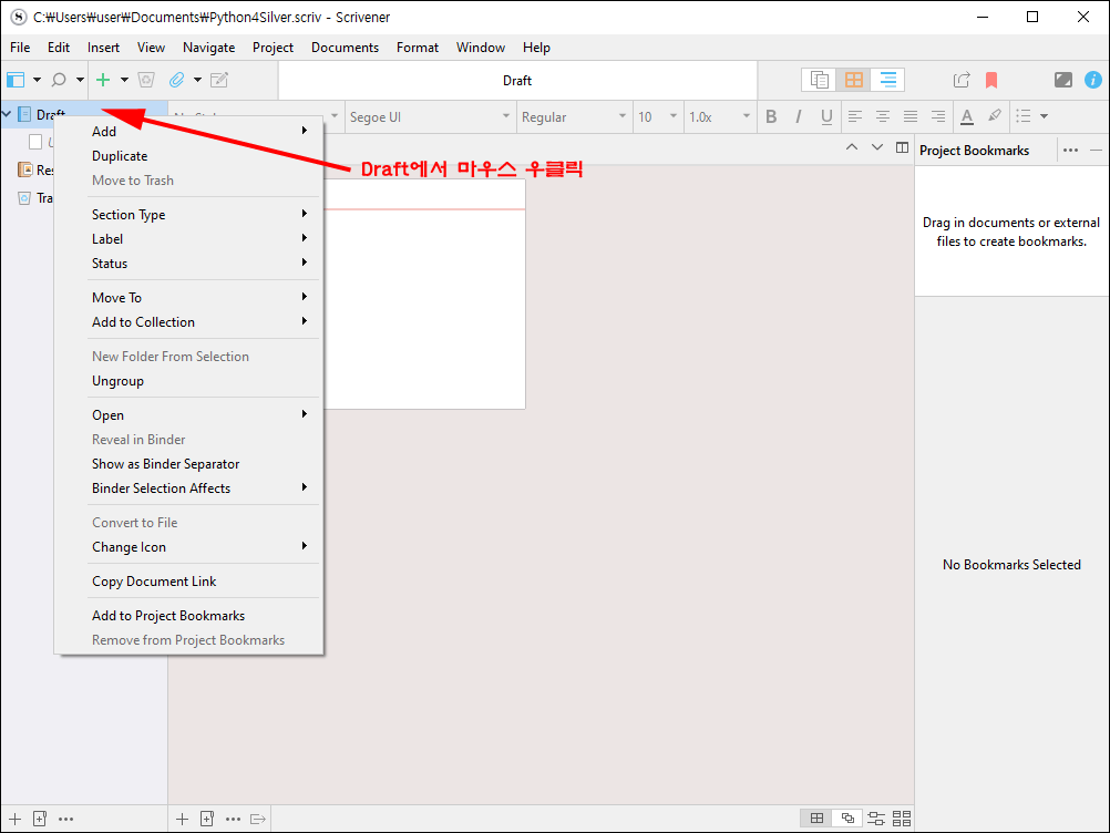 가장 기본이 되는 사용법은 바인더의 해당 텍스트나 폴더에서 마우스 우클릭을 통해 진행합니다. 바인더의 'Draft' 폴더에서 우클릭을 합니다.