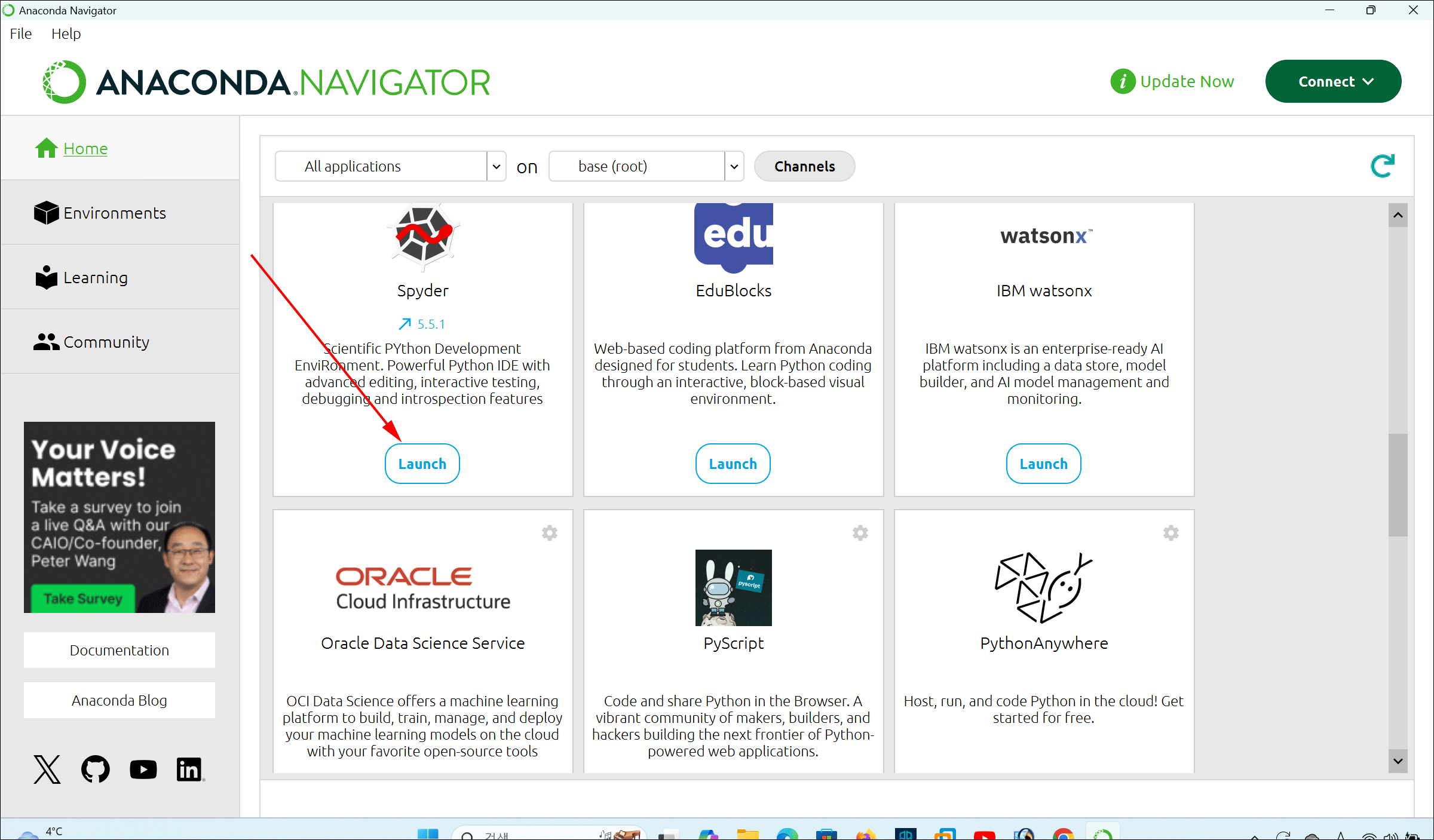 - Windows 시작 메뉴에서 Anaconda Navigator를 실행하고, Spyder를 선택합니다.