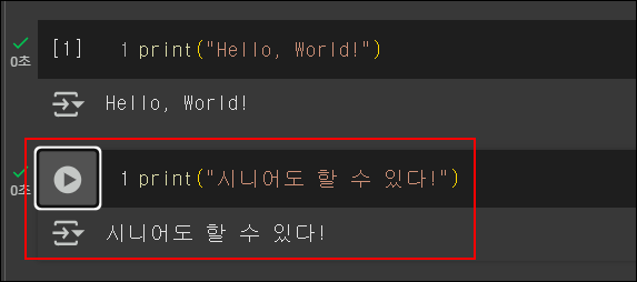 - 셀 왼쪽의 실행 버튼(▶)을 클릭하거나, 단축키 Shift+Enter를 눌러 실행합니다.