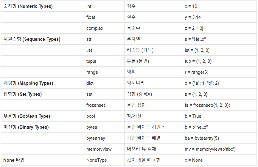 | 이진형 | bytes, bytearray, memoryview | 바이너리 데이터 |