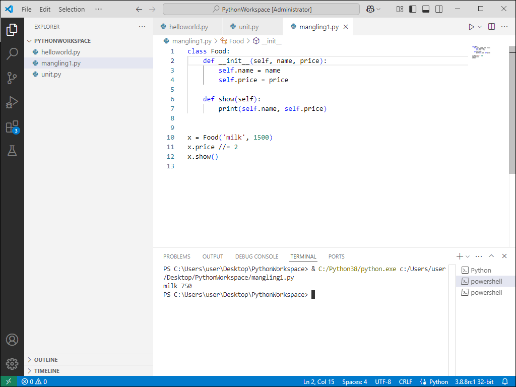 | mangling1.py | self.price (공개 속성) | x.price | 정상 실행 |