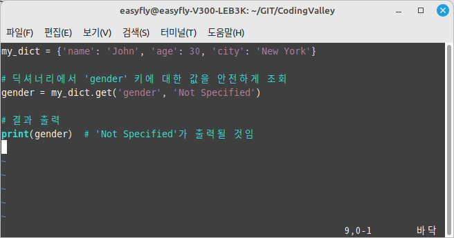 print(my_dict.get('gender', 'Not Specified')) # 출력: Not Specified