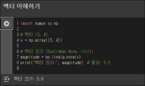 print("벡터 크기:", magnitude) # 결과: 5.0