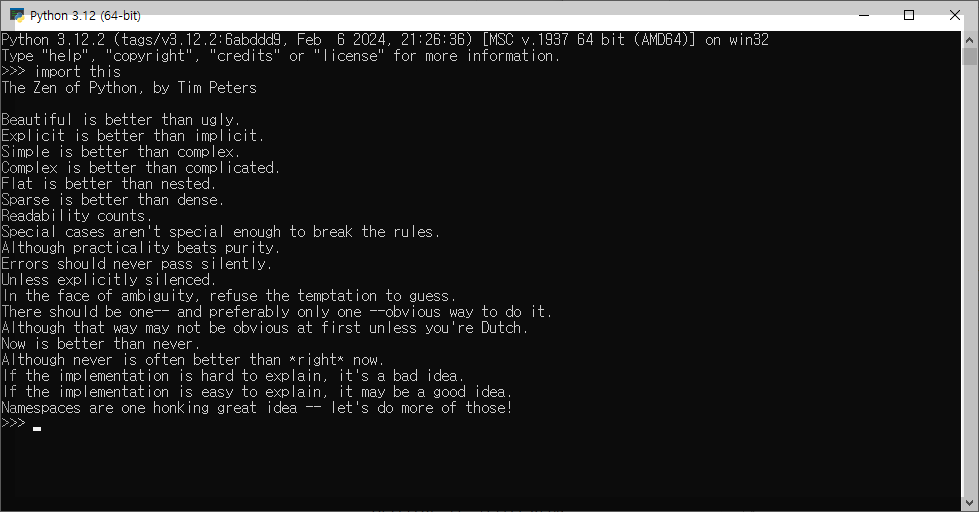 파이썬의 철학은 파이썬 프로그래밍 언어의 19ㄱ지 지도 원리로 구성되어 있습니다. 파이썬 셸에 'import this' 구문을 입력하면 볼 수 있습니다.
