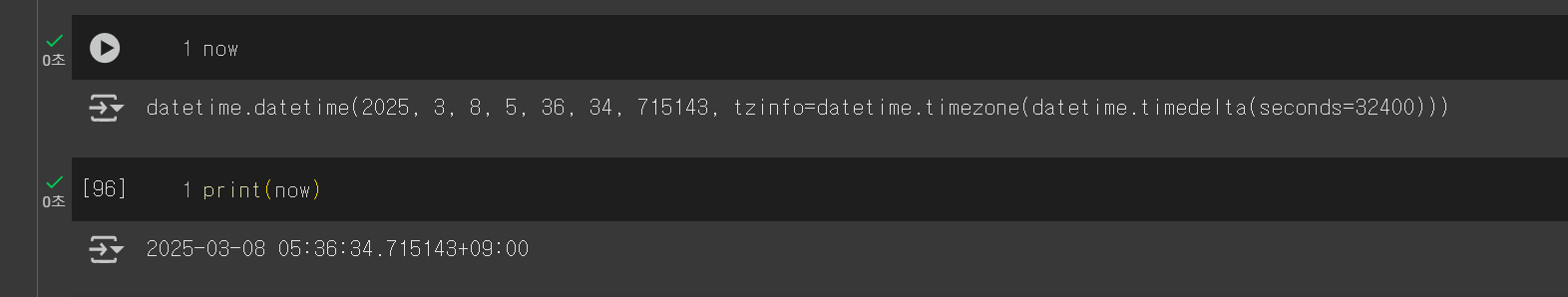 - 타임존 정보 (tzinfo)도 datetime.timezone(datetime.timedelta(seconds=32400)) 형식으로 출력됨.