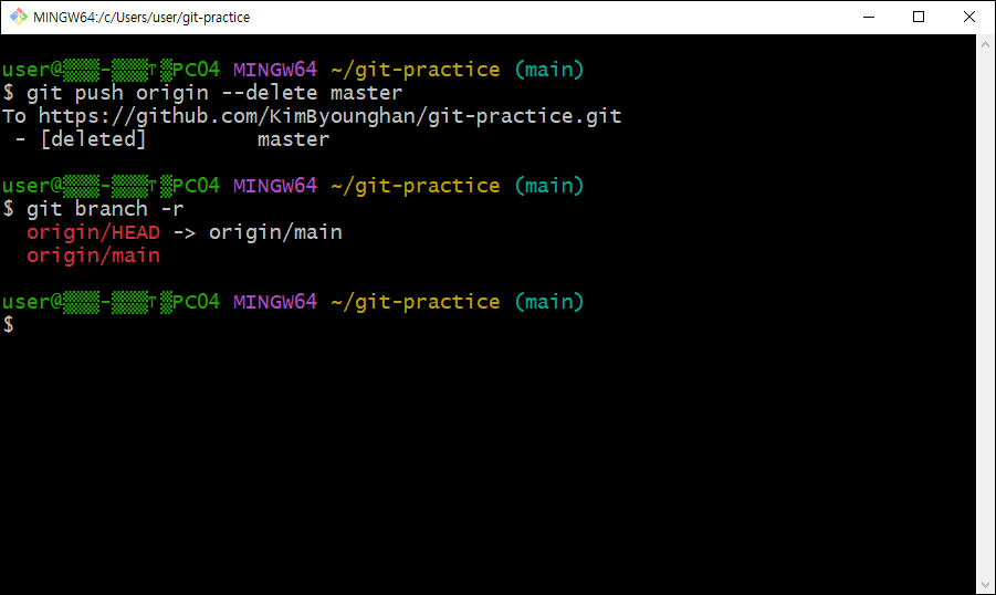 📌 이 명령어는 원격(origin)에 있는 master 브랜치를 삭제합니다.