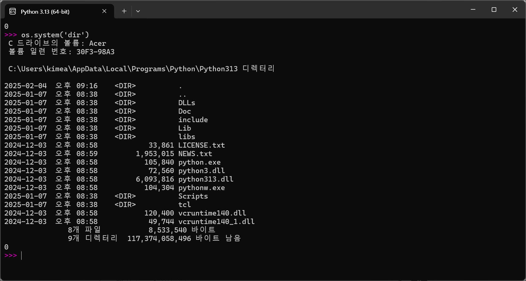 파이썬은 단순한 계산을 넘어서 운영체제의 명령어를 실행할 수 있는 기능도 제공합니다. 이를 가능하게 하는 것이 바로 os 모듈입니다. 이번 글에서는 os.system() 함수를 활용하여 윈도우 명령어인 dir을 실행하고, 현재 디렉터리 내용을 확인하는 방법을 예제로 소개합니다.