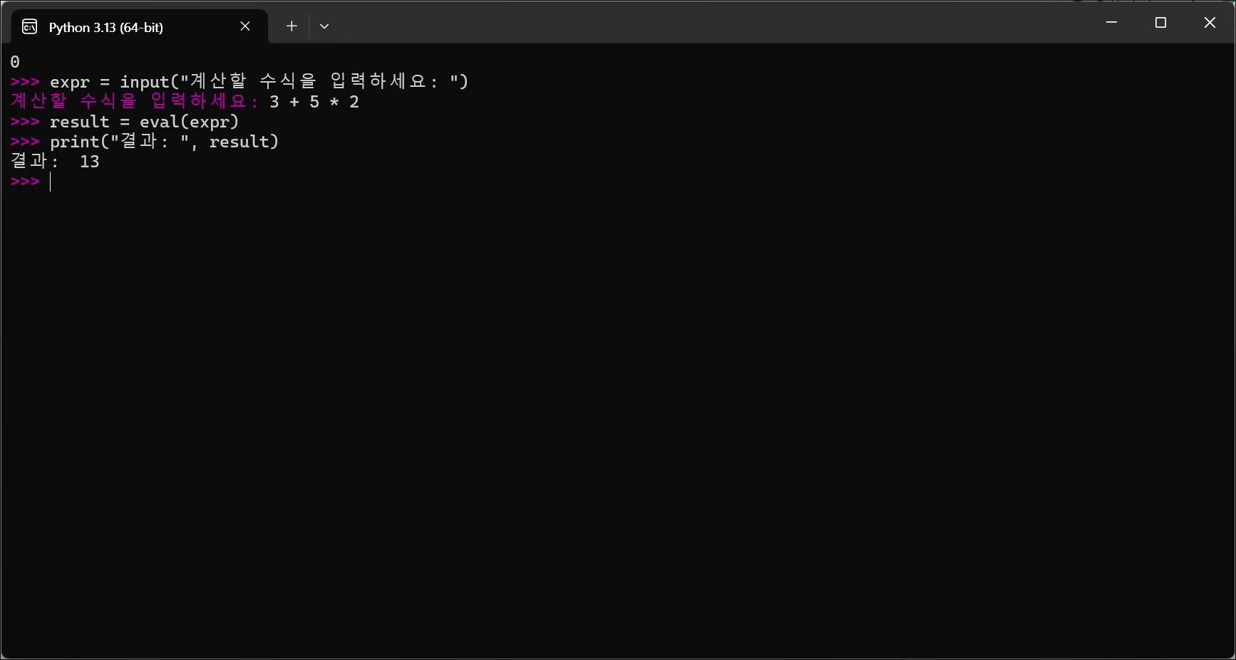 eval()은 매우 강력하지만, 동시에 보안상 위험한 함수입니다. 왜냐하면 사용자가 입력한 문자열을 그대로 실행하기 때문에 악의적인 코드도 실행될 수 있습니다.