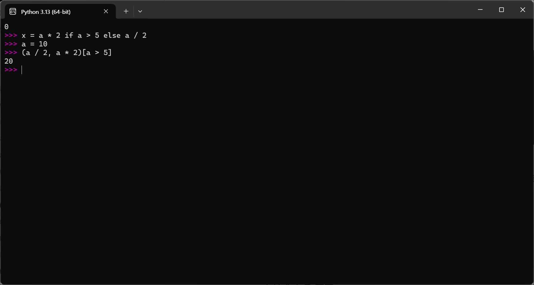 파이썬에서 삼항 연산자(ternary operator)는 조건에 따라 값을 선택하는 간결한 표현식입니다. 정식 명칭은 조건 표현식(conditional expression)입니다.