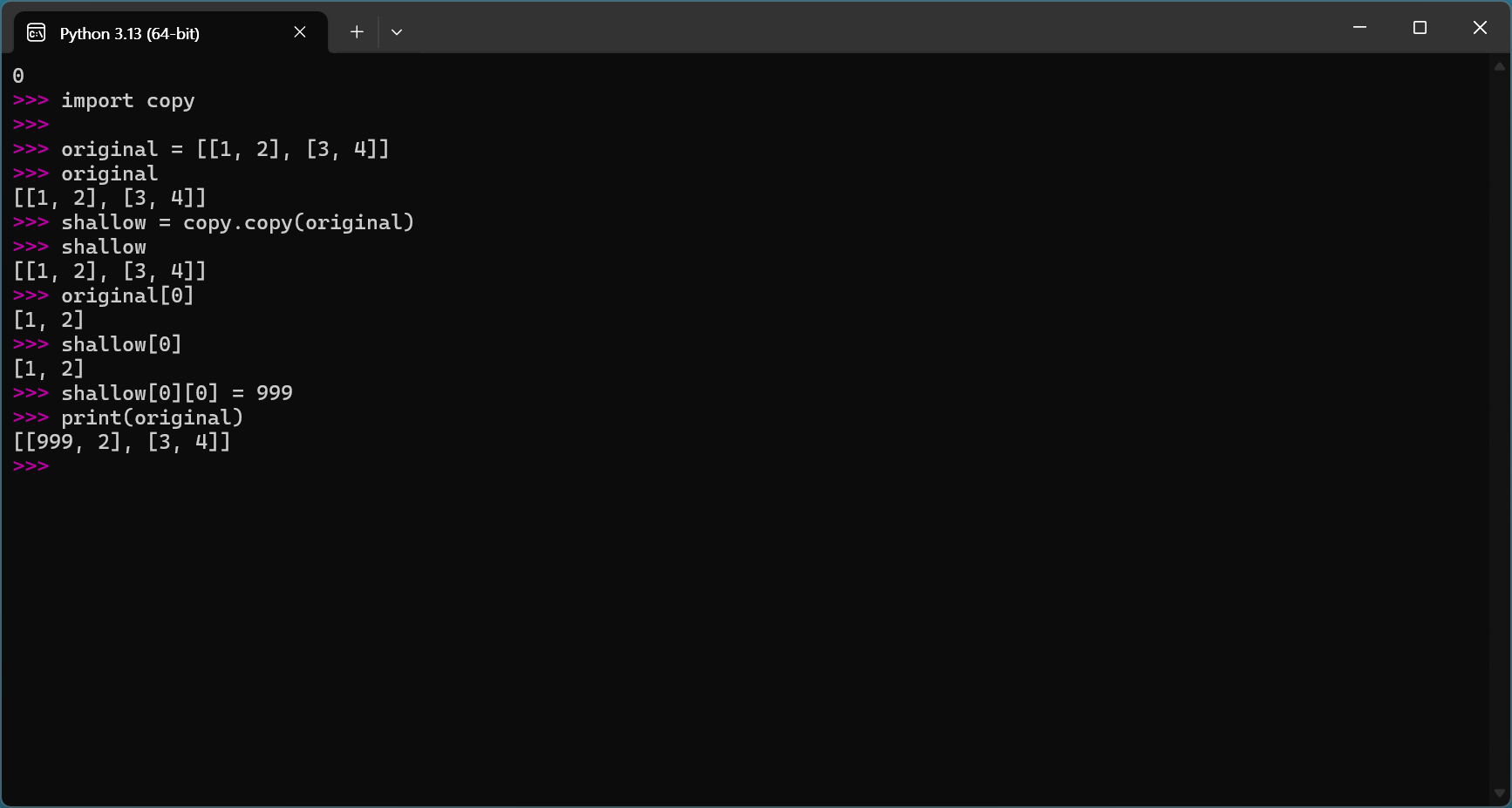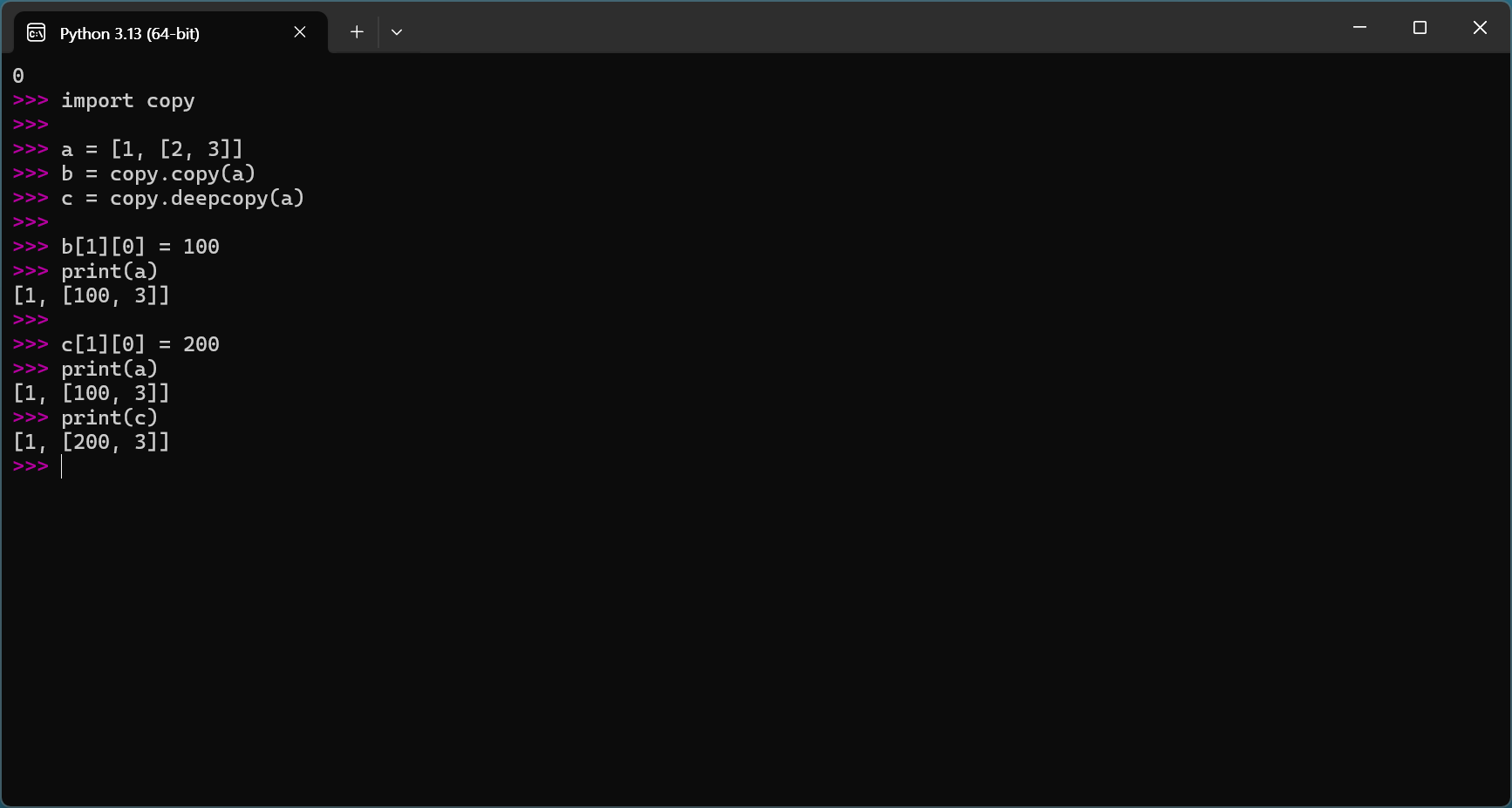 | 항목 | 얕은 복사 (copy.copy) | 깊은 복사 (copy.deepcopy) |