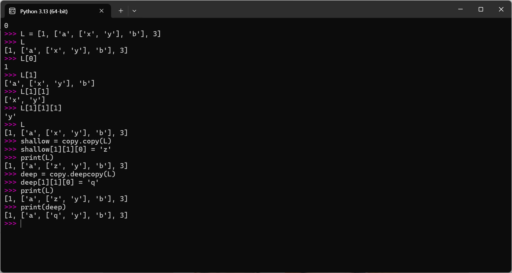- L[0] = 1 L[1] = ['a', ['x', 'y'], 'b'] L[2] = 3