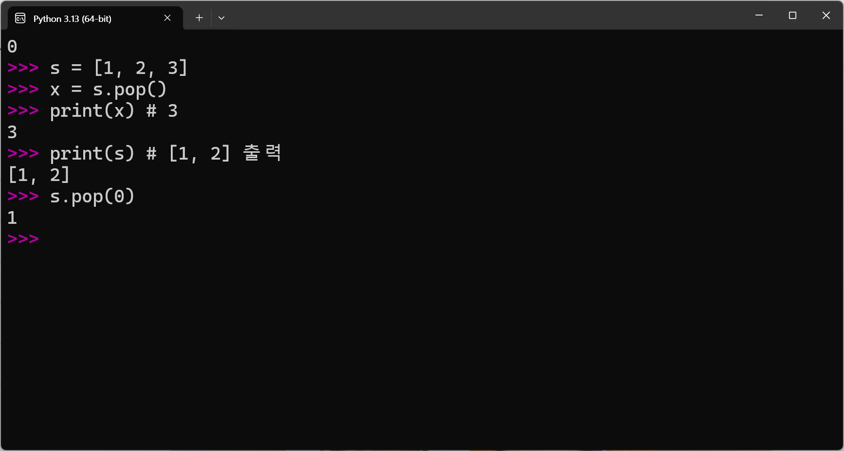 pop(index)처럼 인덱스를 지정할 수도 있습니다.