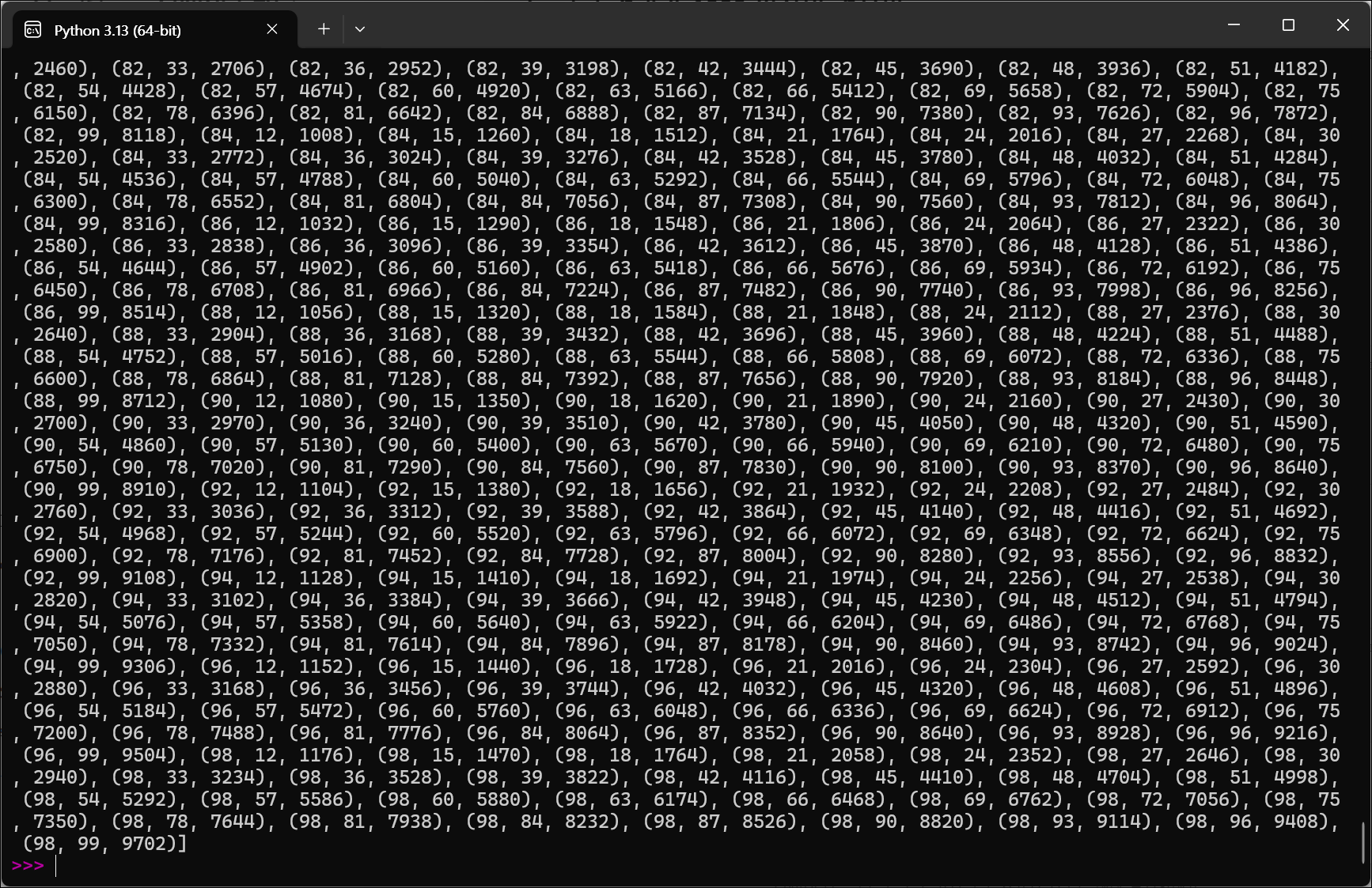 L = [(i, j, i * j) for i in range(2, 100, 2)