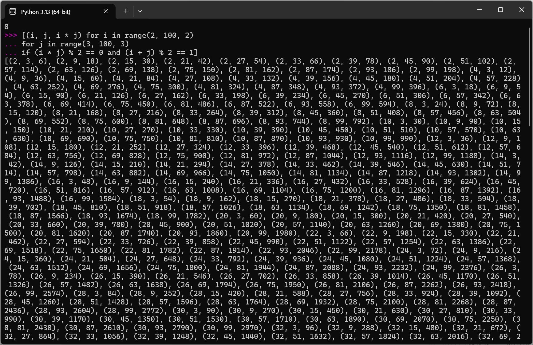이번 실습은 세 수 i, j, i * j로 구성된 튜플을 생성하되, 특정 조건을 만족하는 경우만 리스트에 포함시키는 예제입니다.