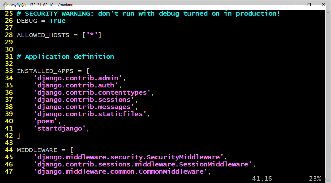 INSTALLED_APPS 항목에 아래 두 줄을 추가합니다: