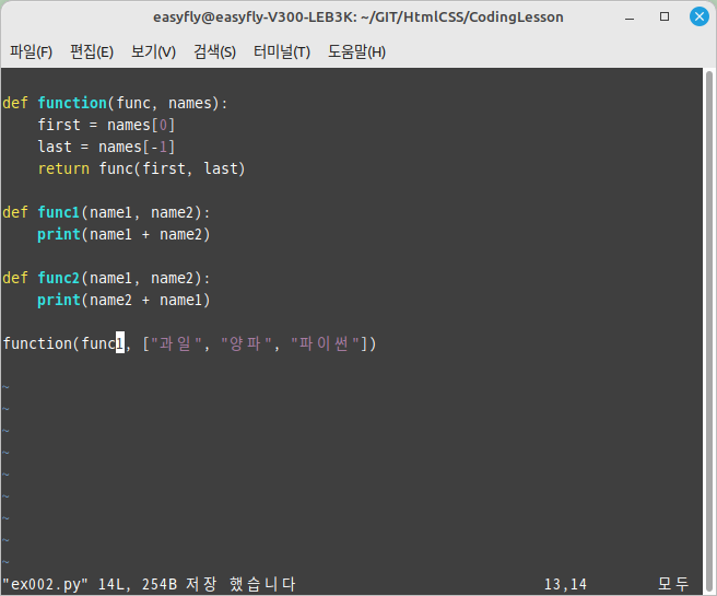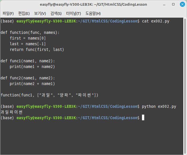 이 경우, function 함수는 func2에 첫 번째 원소 "과일"과 마지막 원소 "파이썬"을 인자로 전달합니다. 따라서 func2 함수는 "파이썬"과 "과일"을 순서를 바꿔 이어 붙인 "파이썬과일"을 출력하게 됩니다.