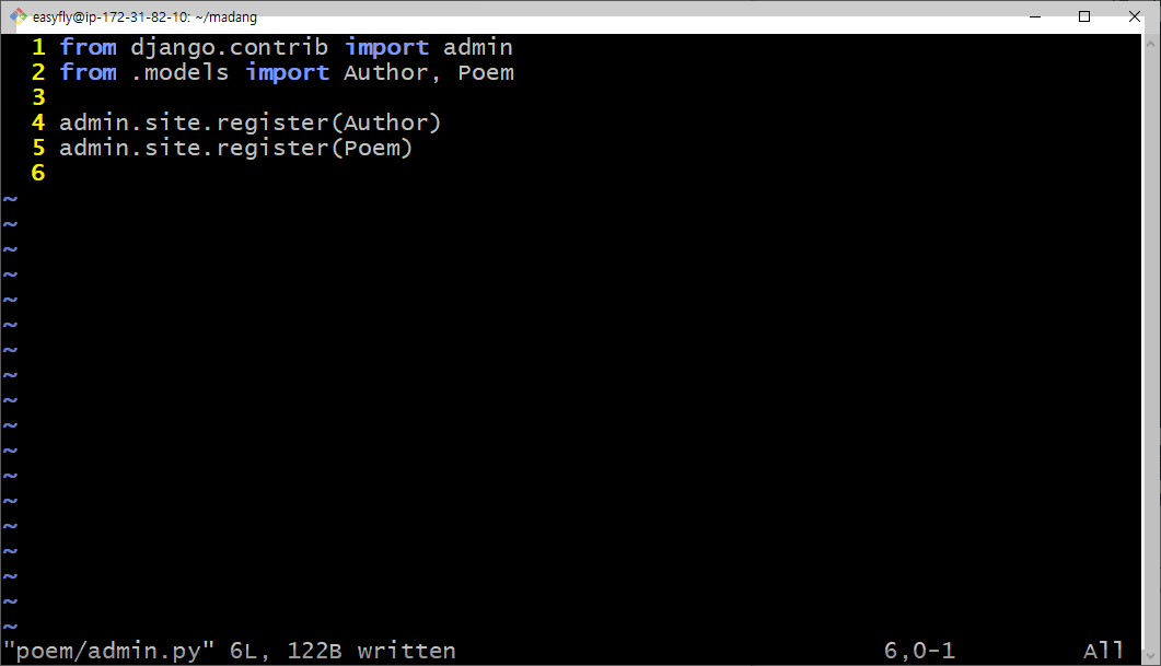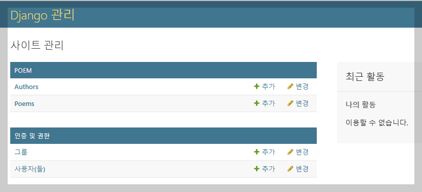 이 코드를 통해 Author와 Poem 모델이 관리자 화면에 보이게 됩니다.