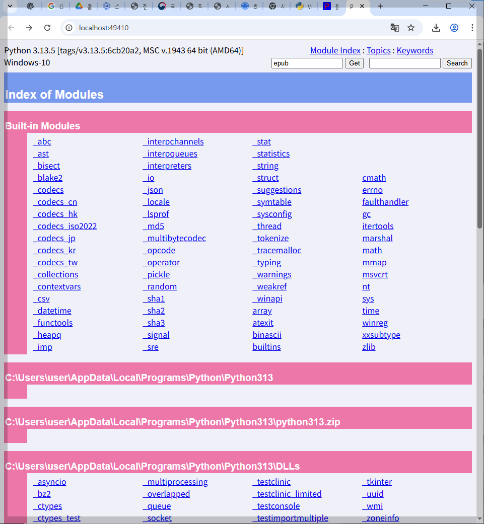 명령 프롬프트에서 아래 입력:→ 웹 브라우저에서 로컬 문서 서버가 열립니다 (localhost:49410과 같은 포트). - python -m pydoc -b