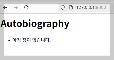 - <h1>Autobiography</h1> <ul> {% for ch in object_list %} <li><a href="{% url 'chapter_detail' ch.pk %}">{{ ch.order }}. {{ ch.title }}</a></li> {% empty %}<li>아직 장이 없습니다.</li>{% endfor %} </ul>