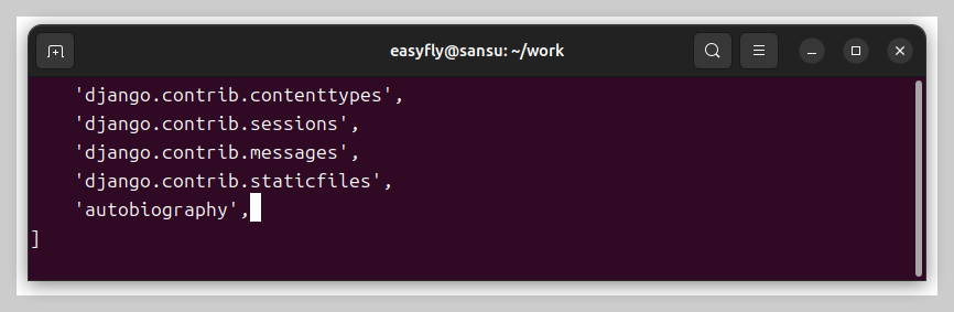 config/settings.py의 INSTALLED_APPS에 'autobiography' 추가 후: