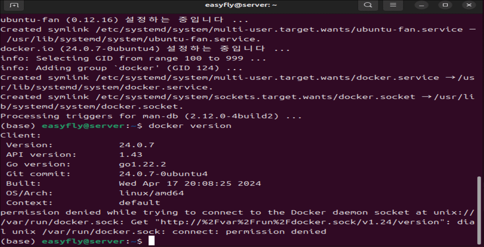 'sudo apt install docker.io' 는 한줄로 간단하게 설치하는 우분투 계열의 설치 방법입니다. apt 설치 관리자로 설치한 경우는 바로 docker 설치를 확인할 수 있습니다. 'docker version'으로 확인합니다. 다만, 퍼미션 문제가 남았기 때문에 docker 그룹에 현재 계정을 등록해줘야 사용이 편해집니다.