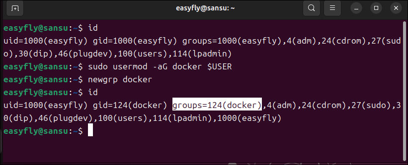 id # groups에 docker가 보이면 정상