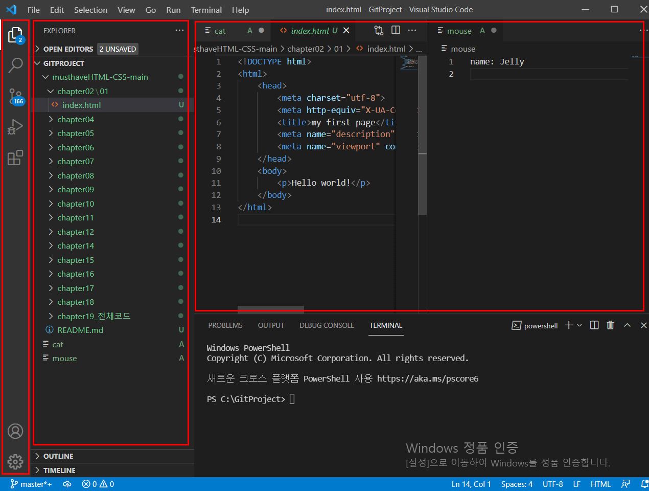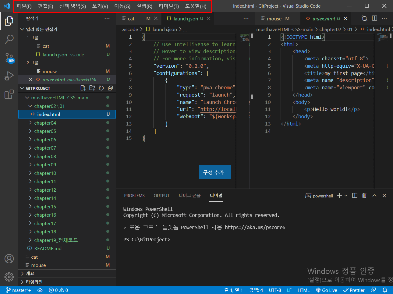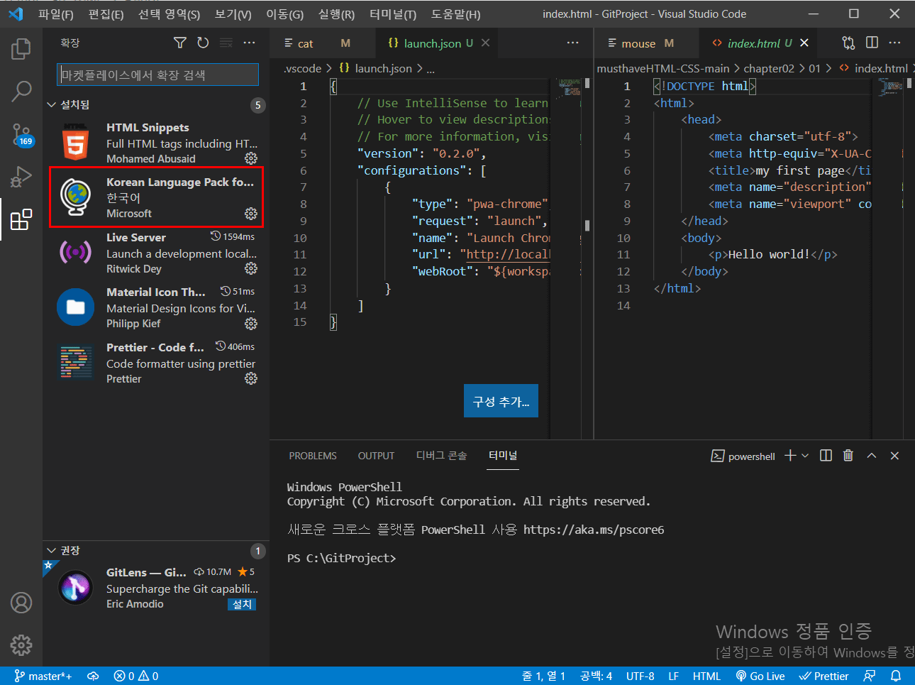 제일 왼쪽 작업바는 위에서 아래로 순서대로 탐색기, 검색, 소스제어, 실행, 확장, 계정, 관리 기능을 제공합니다. 이 중 실행과 확장 기능을 많이 사용합니다.