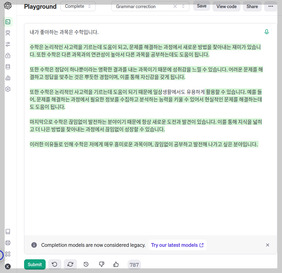 - 복잡한 요청 처리: Complete 모드에서 AI는 보다 복잡한 요청과 작업을 수행할 수 있습니다. 예를 들어, 긴 글을 요약하거나, 특정 주제에 대한 상세한 정보를 제공하는 등의 작업입니다.