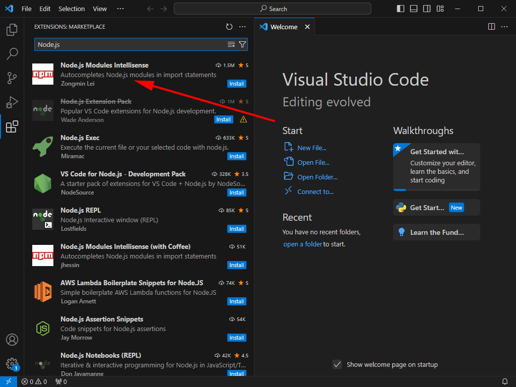 Node.js Extension Pack또는ESLint,Prettier같은 특정 확장 프로그램을 설치할 수 있습니다.