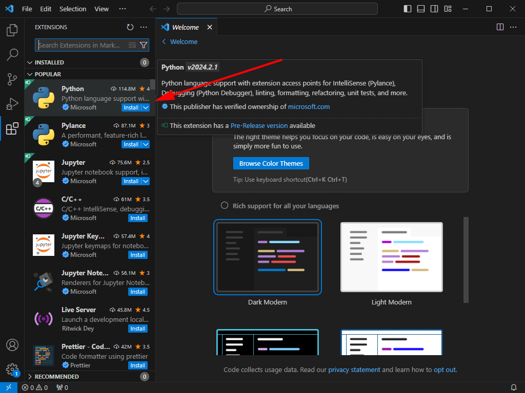 Python을 입력하고 검색 결과 중 Microsoft가 제공하는 Python 확장 프로그램을 설치합니다. - Node.js: Node.js 개발을 위해서는