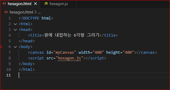 다음 HTML과 JavaScript 파일은 웹 페이지에서 원에 내접하는 6각형을 그리는 예를 보여줍니다.