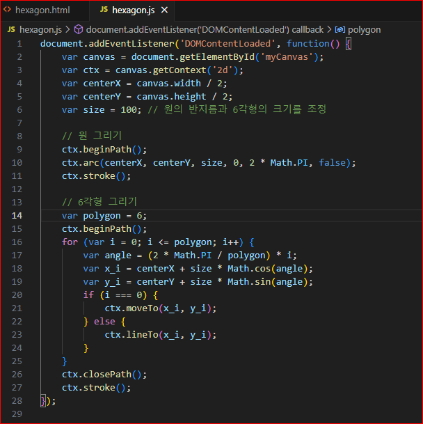 [자바스크립트] 자바스크립트로 내접한 6각형 도형 그리기
