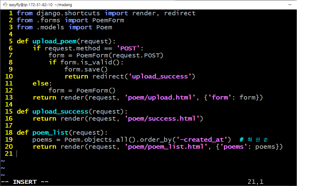 📘 『시마당 프로젝트 따라하기』7장. 업로드된 시 목록 보기 (ListView 만들기)작성자: easyfly작성일: 2025년 7월 14일🟧 1. 시 목록 보기란?업로드된 시를 테이블 또는 박스 형태로 나열하는 기능입니다.시제목, 작가, 등록일자 등을 확인할 수 있습니다.사용자에게 작성 결과를 시각적으로 보여주는 핵심 기능입니다.🟦 2. 뷰 함수 작성 (기본 리스트 뷰)📁 위치madang/poem/views.py📄 코드 추가from .models import Poemdef poem_list(request): poems = Poem.objects.all().order_by('-created_at') # 최신순 return render(request, 'poem/poem_list.htm..