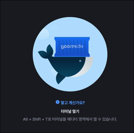 몇 가지 컨테이너 사용에 대한 소개 카드 화면이 지나가면 본격적으로 시작됩니다. 터미널에서 작업할 때는 단축키 'Ctrl + Alt + T'로 터미널을 열어 사용할 수 있습니다. 터미널을 열면 통합개발환경에서 단순한 터미널 형태로 변경됩니다.