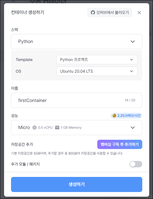 모든 입력 사항이 채워지면 '생성하기' 버튼으로 새 컨네이너가 생성됩니다. 컨테이너는 응용 프로그램과 그 의존성을 함께 패키징하여 어디서나 일관되게 실행할 수 있게 하는 가벼운 가상화 기술입니다. 호스트 시스템의 커널을 공유하면서도 독립된 환경을 제공하여, 리소스 효율성과 배포 용이성을 높입니다. Docker가 대표적인 컨테이너 플랫폼입니다.