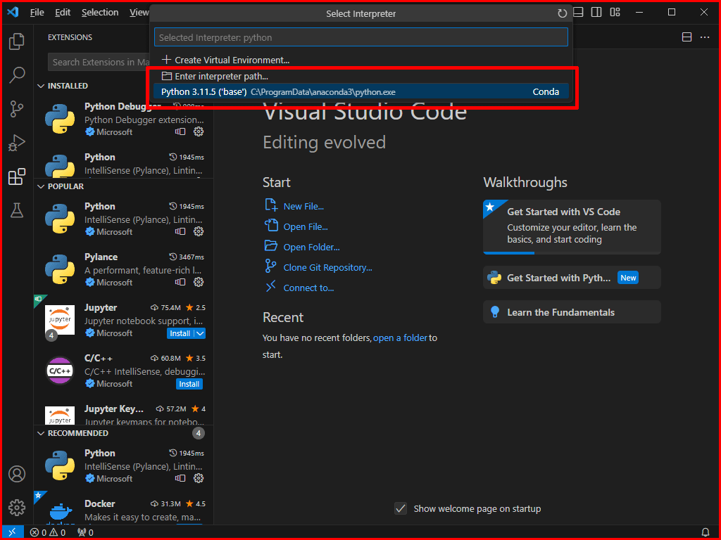 - 선택된 인터프리터: VS Code에서는 파이썬 인터프리터를 선택할 수 있습니다. 이는 파이썬 코드를 실행할 때 사용되는 파이썬의 버전을 지정합니다. 이미지에서는 Python 3.11.5 버전이 'base' 환경으로 선택되어 있음을 나타냅니다. 'base'는 보통 Anaconda 설치 시 기본으로 생성되는 환경입니다.
